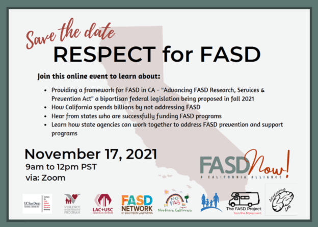 Please join this important online event to learn more about the federal FASD Respect Act being proposed to Congress, and how California can enhance programs and funding for FASD research, preventions, screening and identification, and services for persons with FASD and their caregivers. Zoom invitation to follow.